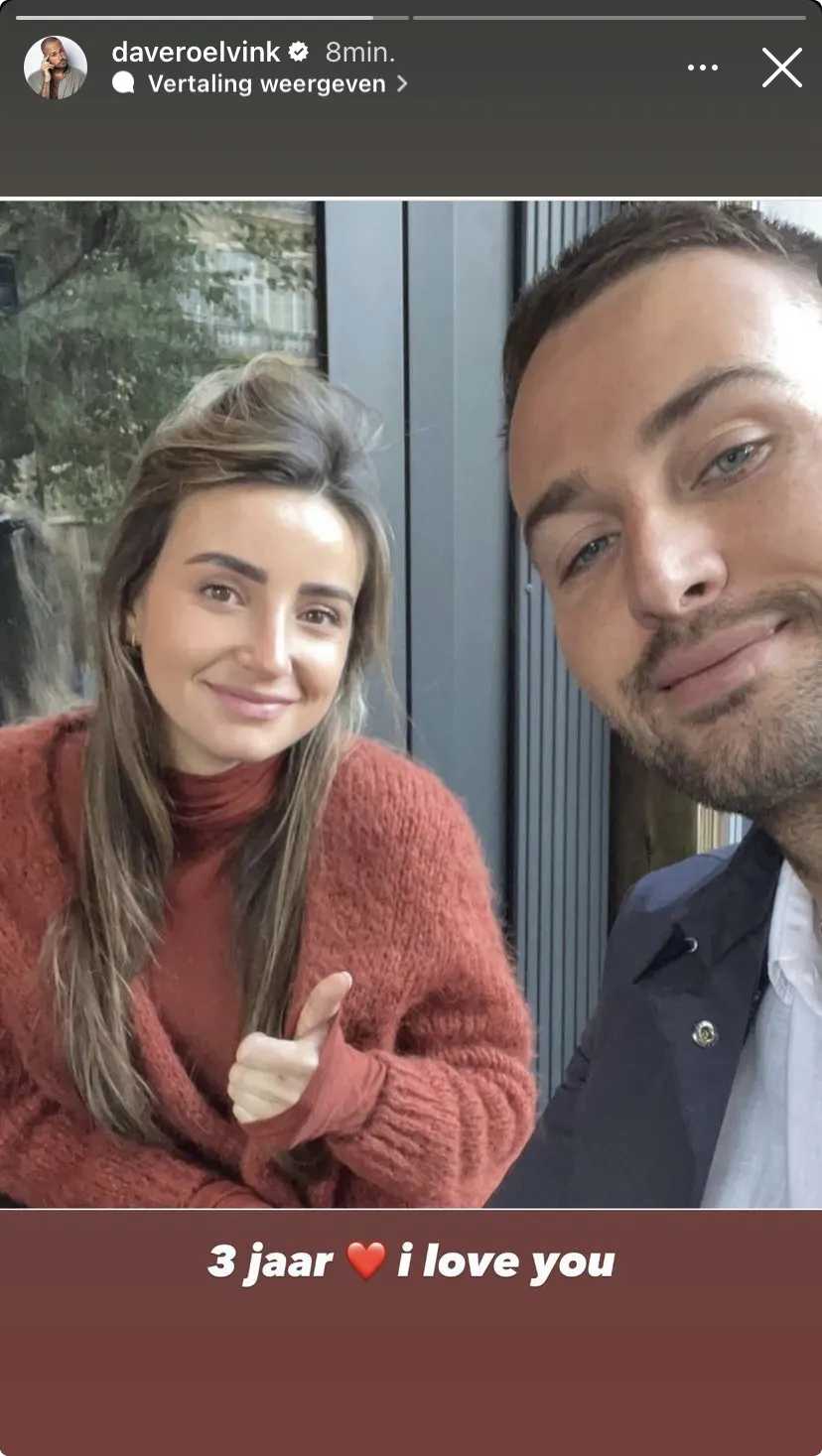 "3 jaar, ik hou van je", zo schrijft Dave in zijn Instagram Stories. Het stel is ontzettend verliefd op elkaar en zijn de trotse ouders van hun zoontje Dean.