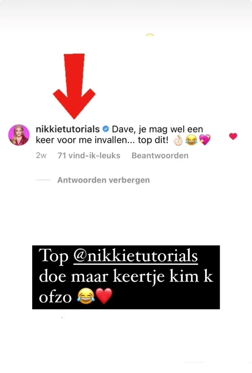 ‘’Dave, je mag wel een keer voor me invallen… Top dit!’’ schrijft het make-upfenomeen op Instagram. Nikkie heeft met haar 14,5 miljoen Instagramvolgers en 13,8 miljoen YouTube-abonnees inmiddels een heel grote schare fans door haar make-uptutorials. Dit zou dus zomaar eens de internationale beauty-doorbraak van Dave kunnen betekenen…