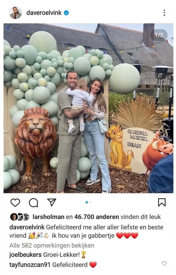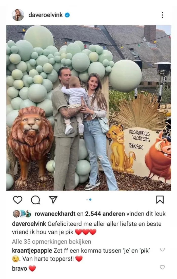 Dave Roelvink (28) heeft een gênante taalfout gemaakt bij een post over zijn jarige zoontje. "Gefeliciteerd me aller aller liefste en beste vriend ik hou van je pik". Meer over de verjaardag van Dean Roelvink, bekijk je in de video hierboven