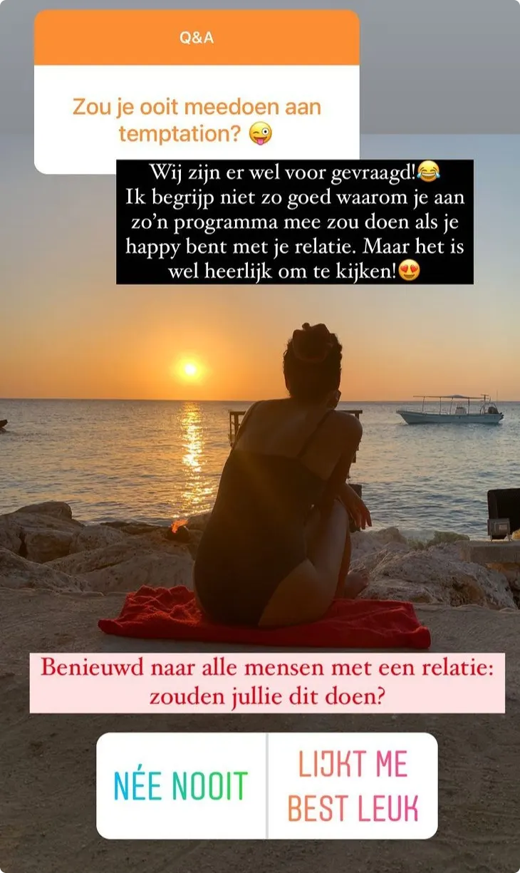 Moïse Trustfull laat weten dat zij en haar vriend Kaj van der Voort zijn gevraagd om mee te doen aan het programma. Maar ze hebben vriendelijk bedankt. "Wij zijn er wel voor gevraagd', reageert Moïse in een Q&A op haar Instagram Stories. "Ik begrijp niet zo goed waarom je aan zo'n programma mee zou doen als je happy bent met je relatie. Maar het is wel heerlijk om te kijken", biecht ze op. De dochter van Quinty leerde Kaj in de zomer van 2015 kennen. Pas later is de vonk tussen de twee overgesprongen.