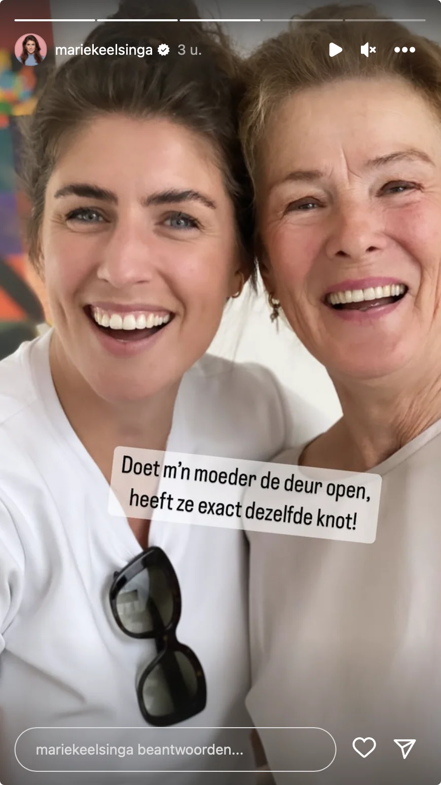 Zo nu en dan plaatst Marieke een te schattig filmpje van zoontje Jip op Instagram (zie video). Dit keer is het de beurt aan de moeder van Marieke. Ze deelt een heerlijke kiekje via Instagram Stories met haar volgers. "Doet m'n moeder de deur open, heeft ze exact dezelfde knot!", schrijft Marieke erbij.