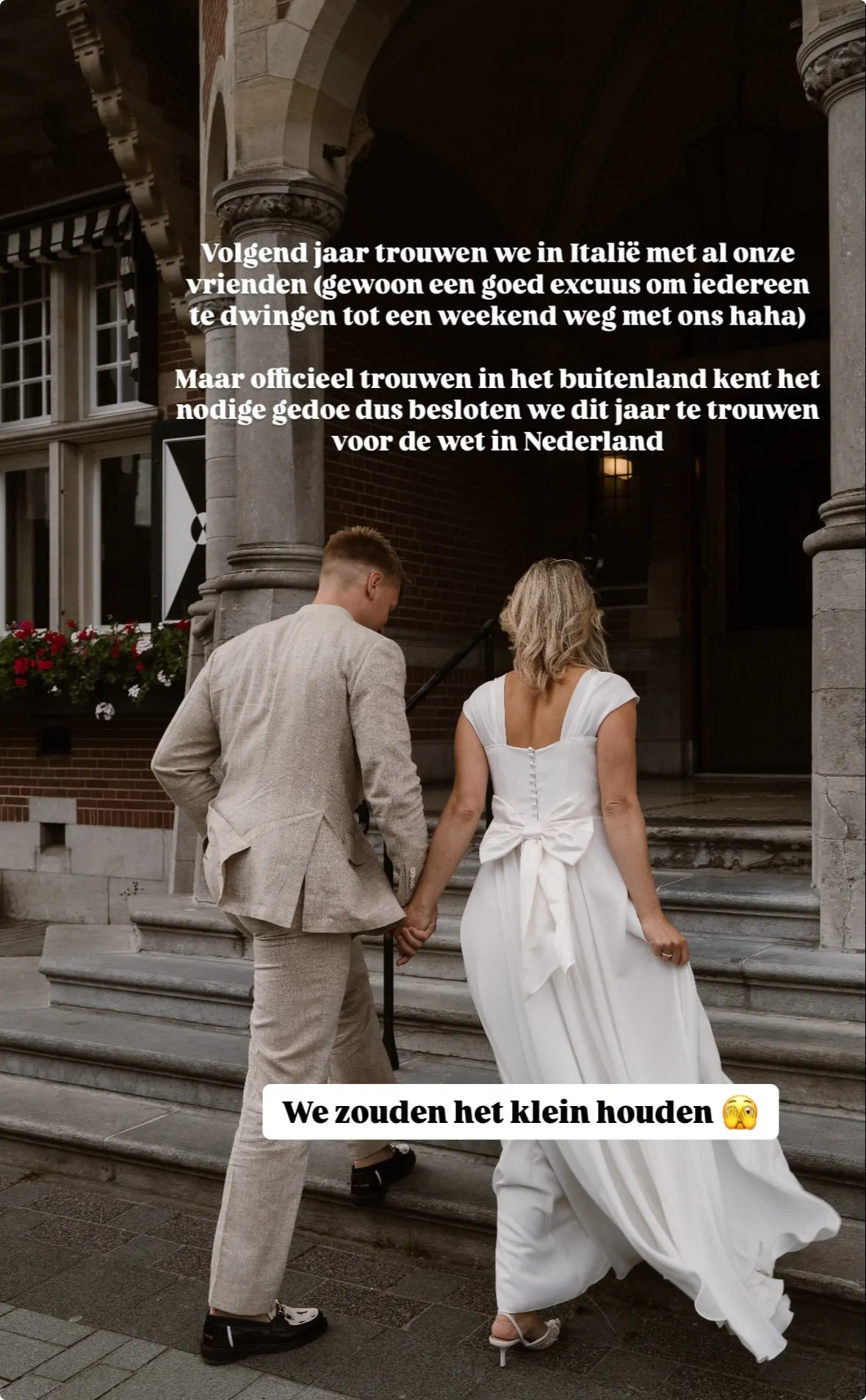 "Volgend jaar trouwen we in Italië met al onze vrienden (gewoon een goed excuus om iedereen te dwingen tot een weekend weg met ons haha). Maar officieel trouwen in het buitenland kent het nodige gedoe dus besloten we dit jaar te trouwen voor de wet in Nederland", legt ze aan haar volgers uit. Volgens haar was het "een dag om nooit te vergeten".