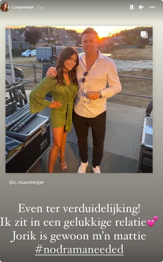 Sinds de beelde online worden verspreid, wordt er volop gefluisterd dat zij en de rapper elkaar misschien wel heel erg leuk vinden. Maar volgens Charlotte zijn de twee niet meer dan goede vrienden. In haar Instagram Stories deelt ze een foto waarop ze te zien is met haar huidige vriend en ze schrijft erbij: "Even ter verduidelijking! Ik zit in een gelukkige relatie. Jorik is gewoon m'n mattie. #nodramaneeded."