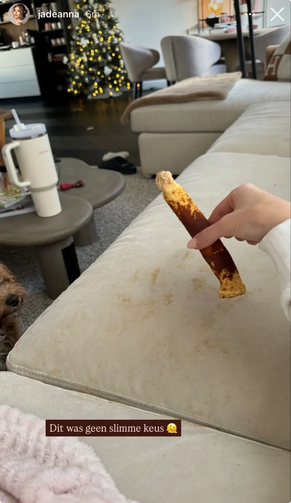 Even later laat ze opnieuw van zich horen, maar dit keer wat minder blij. "Dit was geen slimme keus", zet ze bij een foto van de bank, waarop vlekken te zien zijn. In haar hand houdt ze een botje vast en op de achtergrond zie je Navy, wat lijkt te betekenen dat hij met wat lekkers de beige bank vies heeft gemaakt...