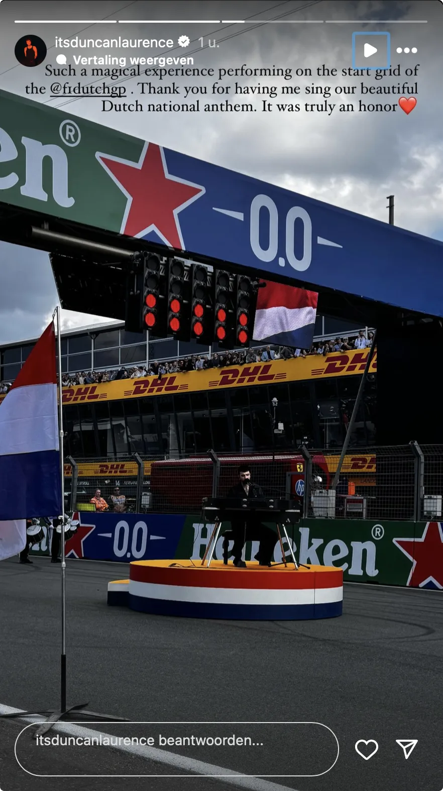 "Wat een magische ervaring om op te treden op de startgrid van de Nederlandse Formule 1 Grand Prix", schrijft de zanger. "Bedankt dat ik ons prachtige Nederlandse volkslied mocht zingen. Het was echt een eer."