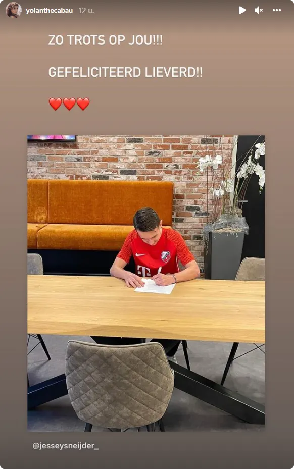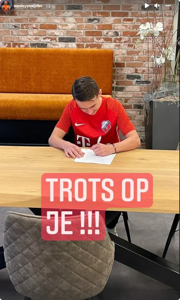 De appel valt niet ver van de boom blijkt maar weer voor vader en zoon Sneijder. Voor de 15-jarige Jessey Sneijder, oudste zoon van de oranje-recordinternational komt een droom uit. Jessey tekent zijn eerste jeugdcontract bij FC Utrecht en Wesley deelt dit met ons op zijn Instagram.