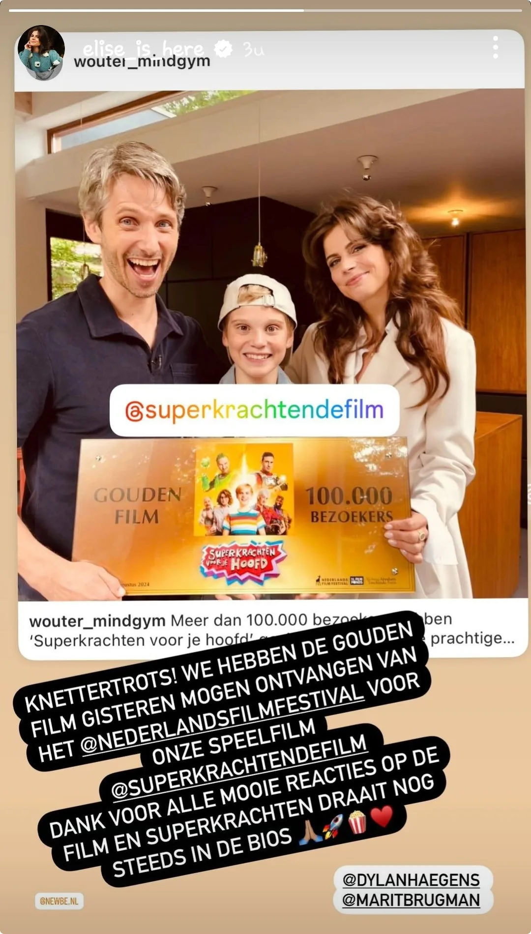 Elise laat via Instagram weten "knettertrots" te zijn op de onderscheiding: "We hebben de Gouden Film gisteren mogen ontvangen van het Nederlands Filmfestival voor onze speelfilm Superkrachten voor je hoofd," schrijft de actrice in haar Instagram-story (zie onderstaande foto). Ze is dankbaar voor alle mooie reacties op de film.