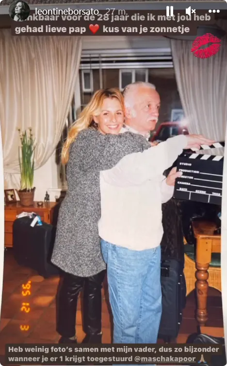 Ze deelt een foto uit de oude doos met haar overleden vader. "Dankbaar voor de 28 jaar die ik met je heb gehad, lieve pap", schrijft Leontine erbij. "Kus van je zonnetje.