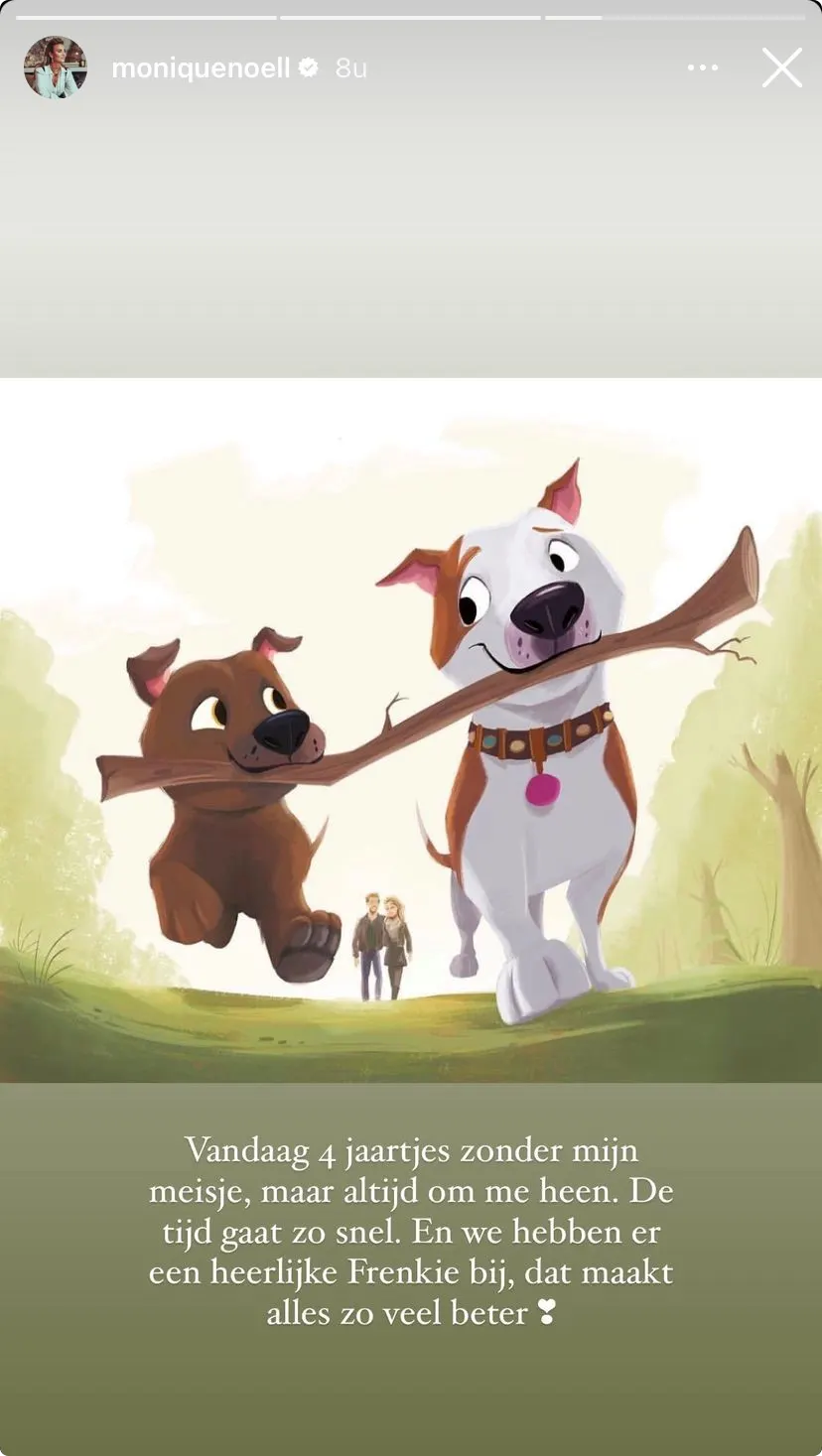 ''We missen jou,'' aldus Westenberg op Instagram bij een foto van het hondje. ''Vandaag vier jaartjes zonder mijn meisje, maar altijd om me heen. De tijd gaat zo snel. We hebben er een heerlijke Frenkie bij, dat maakt alles zoveel beter.''