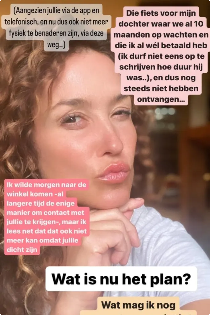 "Aangezien jullie via de app en telefonisch en nu dus ook niet meer fysiek te benaderen zijn via deze weg", zo begint Katja haar bericht in haar Instagram Stories. "Die fiets voor mijn dochter waar we al 10 maanden op wachten en die ik al wél betaald heb (ik durf niet eens op te schrijven hoe duur hij was) en dus nog steeds niet hebben ontvangen..."