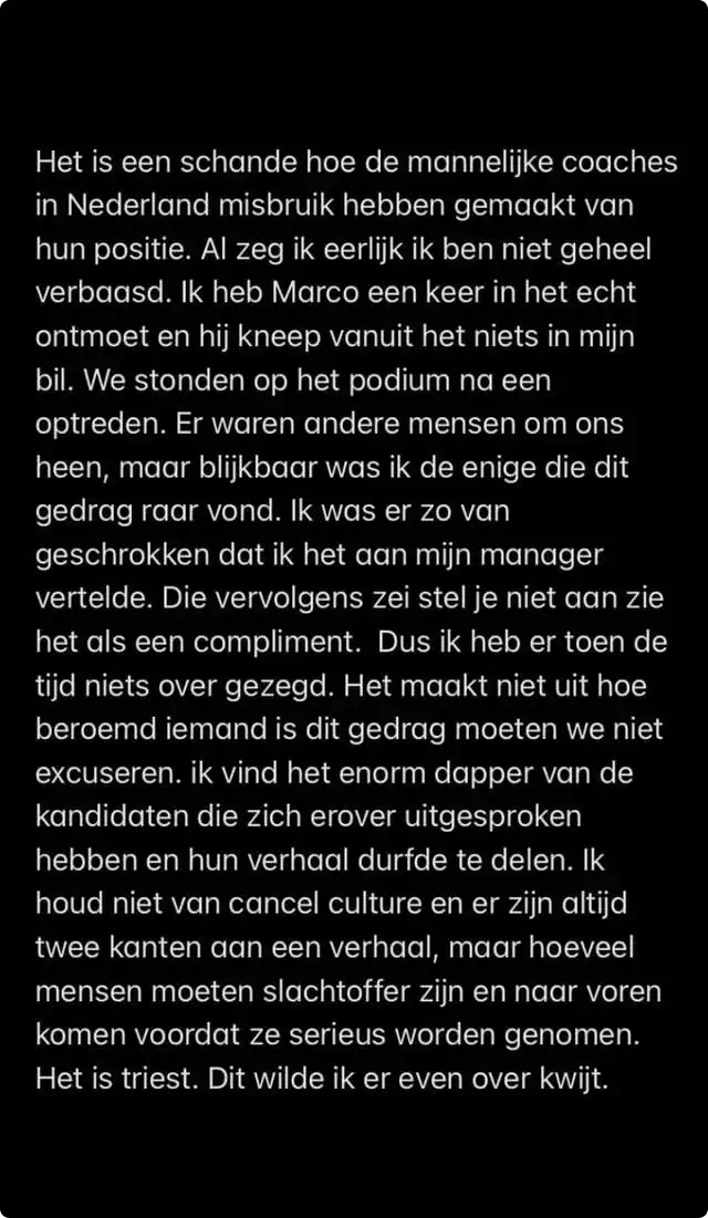 De 33-jarige zangeres reageerde in haar bericht op de uitzending van het onlineprogramma BOOS over de situatie rondom The voice of Holland. "Het is een schande hoe de mannelijke coaches in Nederland misbruik hebben gemaakt van hun positie. Al ben ik niet geheel verbaasd", zegt Denters. Ze vertelt dat ze Borsato ontmoette bij een optreden. "Ik heb Marco een keer in het echt ontmoet en hij kneep me vanuit het niets in mijn bil", schrijft ze. "We stonden op het podium na een optreden. Er waren andere mensen om ons heen, maar blijkbaar was ik de enige die dit gedrag raar vond."