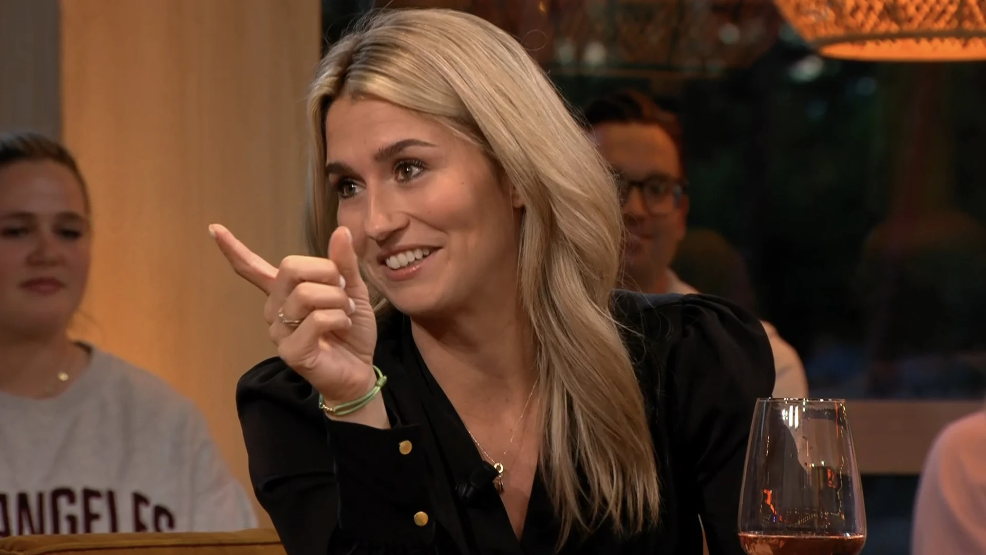 "Misschien kun je ons even meenemen en vertellen of het klopt dat jij hier staat te zingen met Wesley Sneijder?", vraagt presentator Johnny de Mol lachend aan Estavana. "Ja, een paar flessen wijn doen veel met je, hè", antwoordt de vriendin van Rafael van der Vaart.