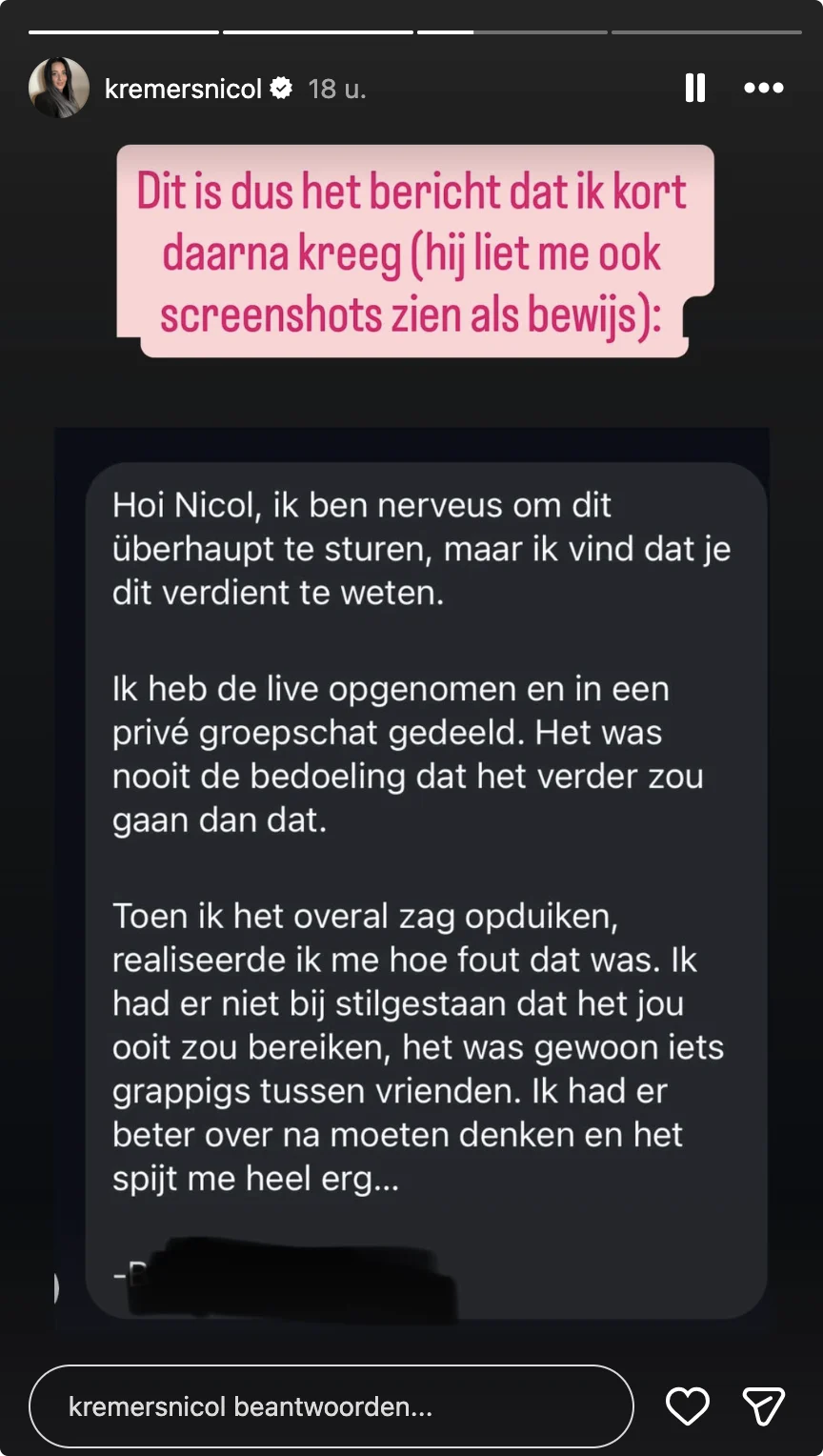 De sexy beelden waren bedoeld voor een besloten kring, maar dat pakte dus anders uit. De persoon die de beelden verspreidde, heeft contact gezocht met Nicol. "Ik heb de live opgenomen en in een privé-groepsapp gedeeld", schrijft de volger. "Het was nooit de bedoeling dat het verder zou gaan dan dat. Toen ik het overal zag opduiken, realiseerde ik me hoe fout dat was. Ik had er niet bij stilgestaan dat het jou ooit zou bereiken. Het was gewoon iets grappigs tussen vrienden. Ik had er beter over na moeten denken en het spijt me heel erg."