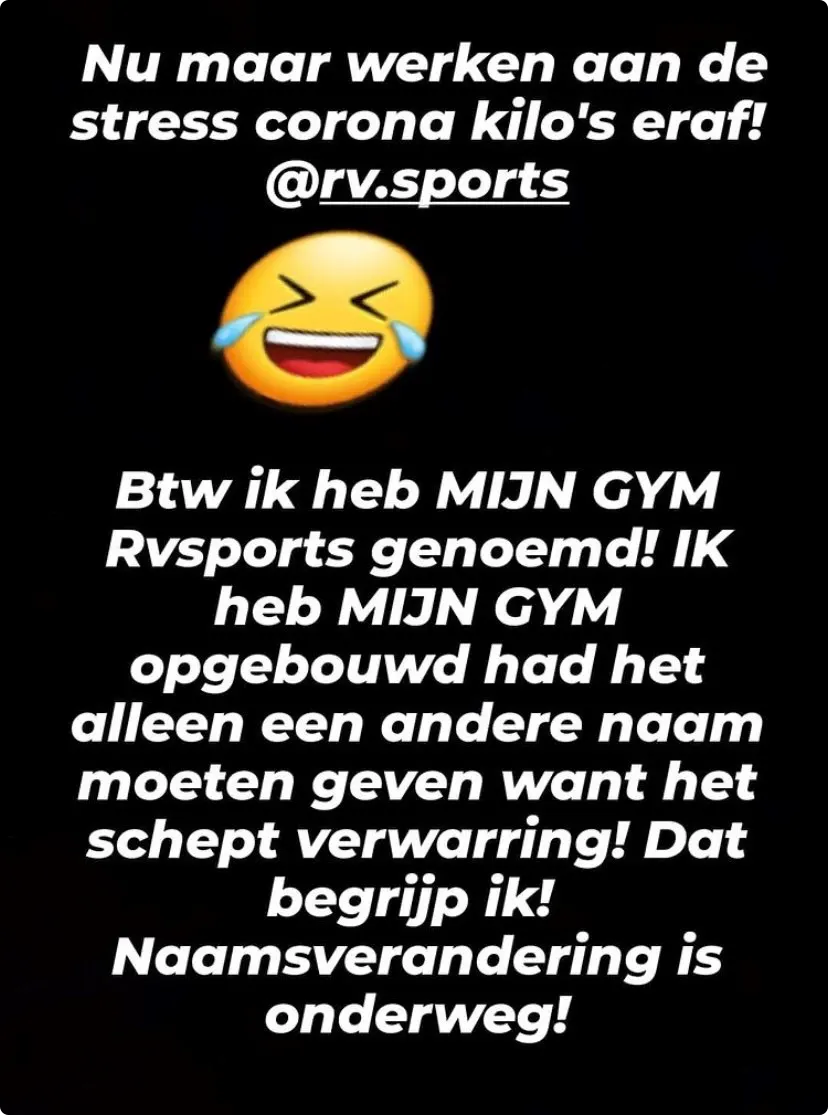 Op Instagram schrijft Jacky dat een naamsverandering onderweg is. "Het schept verwarring. Dat begrijp ik." Op dit moment heet de gym nog RV Sports, wat staat voor Rico Verhoeven Sports.