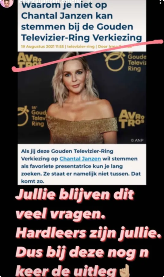 Fans van Chantal Janzen blijven haar maar met vragen bestoken. Ze vragen zich af waarom ze niet op hun favoriete presentatrice kunnen stemmen bij de verkiezing voor de Gouden Televizier-Ster 2021...