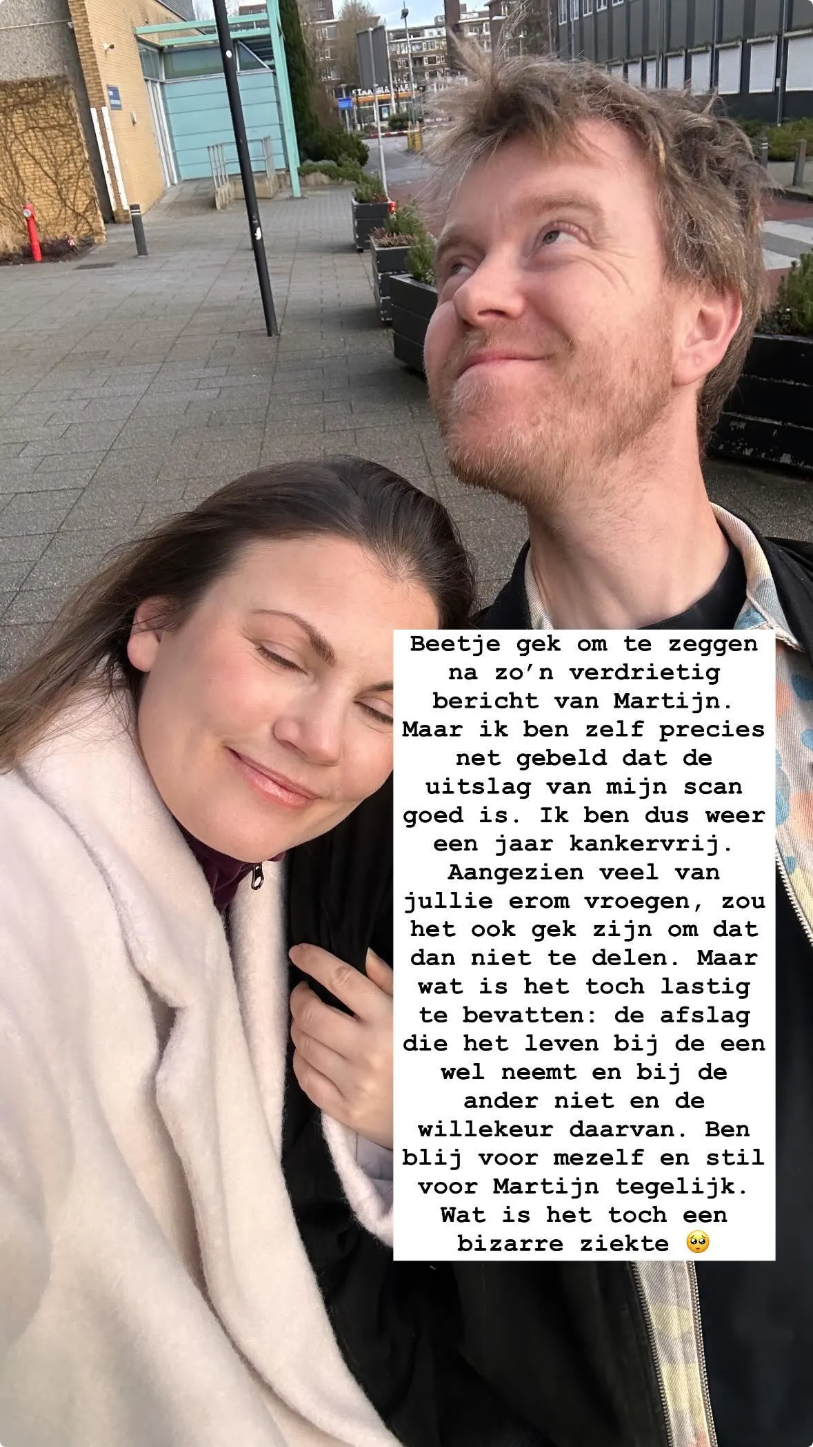 Linda steekt Martijn nog een hart onder de riem. "Aangezien veel van jullie erom vroegen, zou het ook gek zijn om dat niet te delen. Maar wat is het toch lastig te bevatten: de afslag die het leven bij de een wel neemt en bij de ander niet en de willekeur daarvan. Ben blij voor mezelf en stil voor Martijn tegelijk. Wat is het toch een bizarre ziekte."