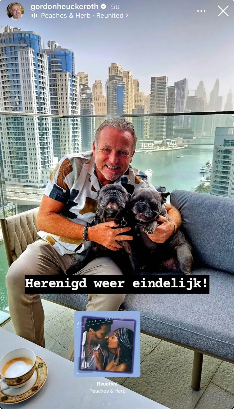 Gordon heeft Nederland weer ingeruild voor Dubai en dat betekent dat hij zijn viervoeters weer in zijn armen kan sluiten. "Herenigd weer eindelijk", schrijft hij in zijn Instagram-verhaal. Eén ding is zeker; de blijheid bij hem én zijn honden spat er vanaf.