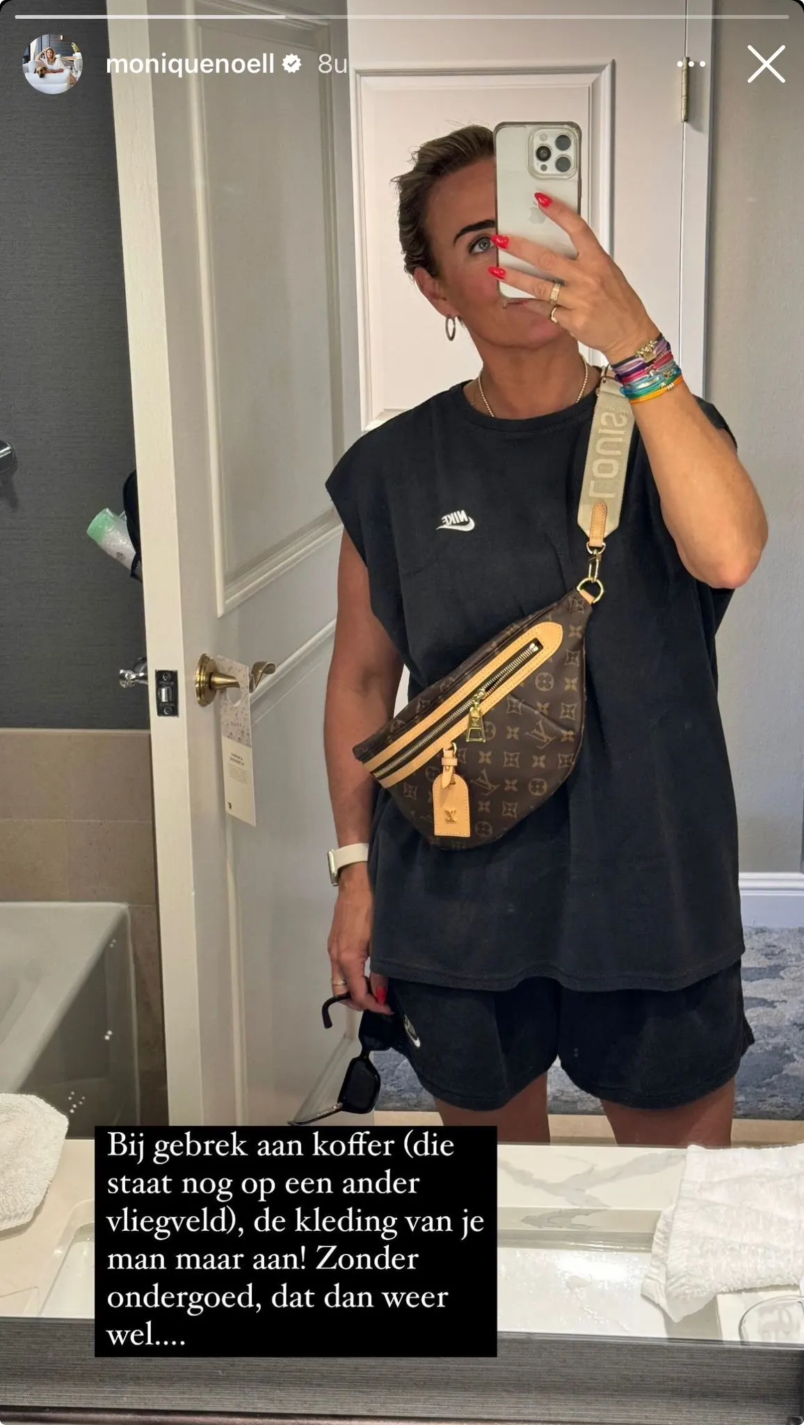Monique haar koffer is namelijk naar een ander vliegveld gegaan. "Bij gebrek aan koffer (die staat nog op een nader vliegveld), de kleding van je man maar aan! Zonder ondergoed, dat dan weer wel...", schrijft ze onder haar Instagram Story.