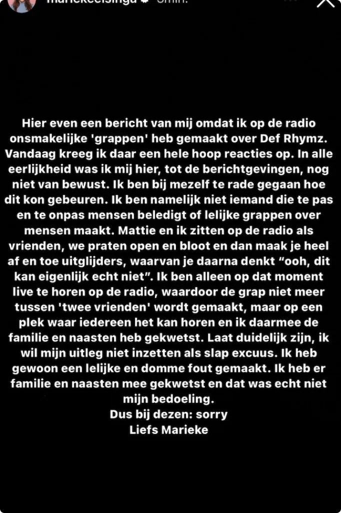 Marieke vroeg of het nummer Schudden, één van Defs hits, met de tekst 'zak, zak, zak' op de begrafenis van de rapper gedraaid zou worden tijdens het zakken van de kist. Later maakte de radio-dj daar uitgebreid haar excuses voor. "Hier even een bericht van mij omdat ik op de radio onsmakelijke 'grappen' heb gemaakt over Def Rhymz", schreef ze in haar verhaal op Instagram Stories (zie foto hieronder, tekst gaat door).
