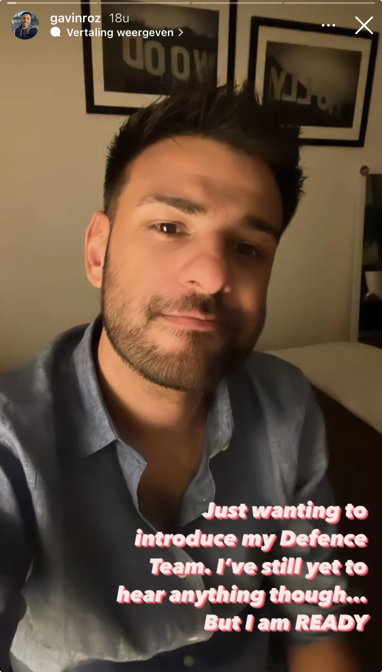 "Wil jullie voorstellen aan mijn verdedigingsteam, ik heb echter nog steeds niks gehoord", zo schrijft Gavin in zijn Instagram Stories. De ex van de zanger lijkt hiermee te doelen op de aangifte die Gordon tegen hem heeft gedaan.