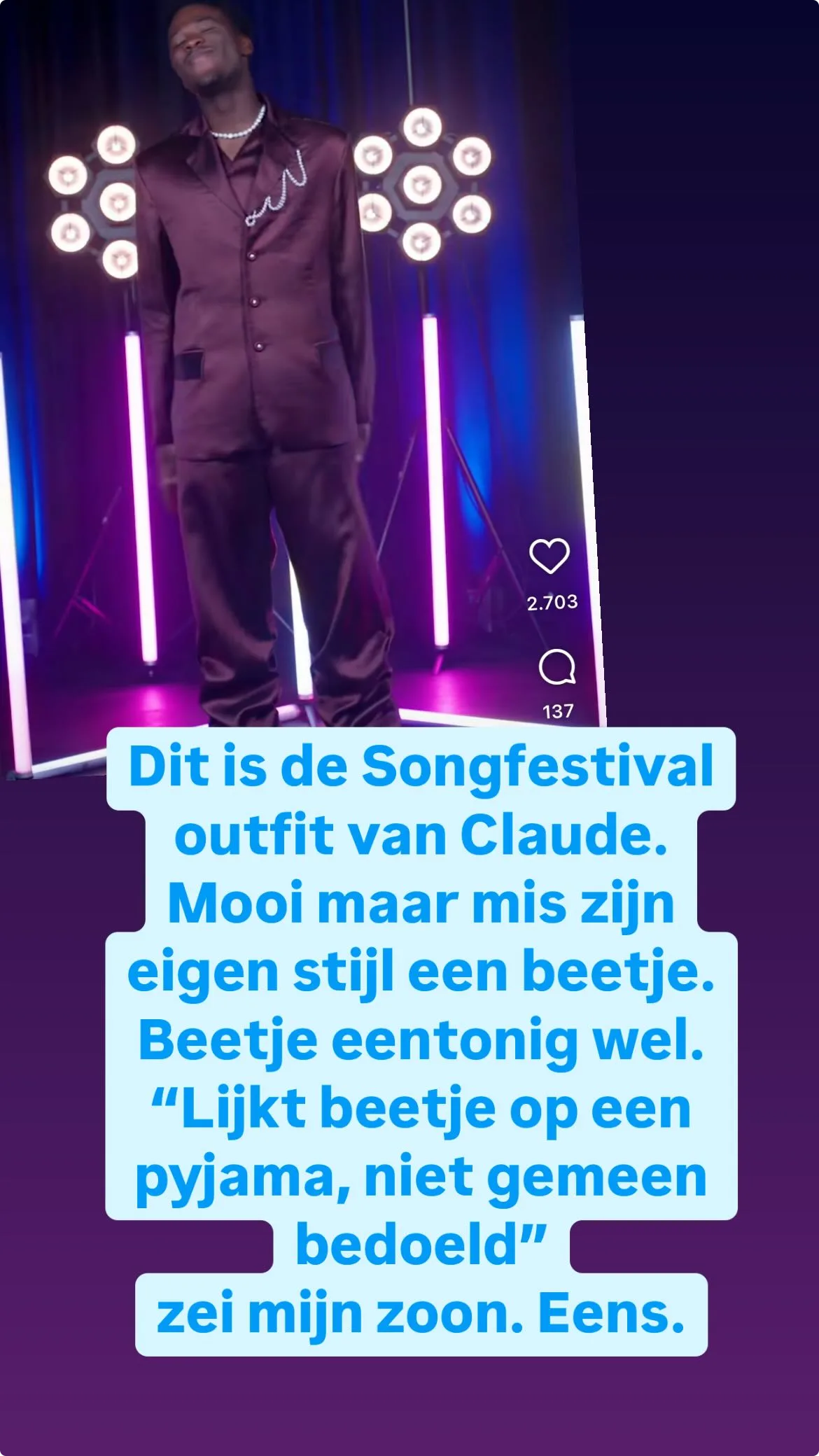 Ook kijkcijferanalist Tina Nijkamp sluit zich hierbij aan: "Dit is de Songfestival-outfit van Claude. Mooi, maar mis zijn eigen stijl een beetje." Ze voegt toe: "Beetje eentonig wel." Daarnaast liet Tina ook de mening van haar zoon doorschemeren. "Lijkt een beetje op een pyjama, niet gemeen bedoeld", zou Tina haar zoon hebben gezegd. De kijkcijferkoningin kan zich daar wel in vinden.