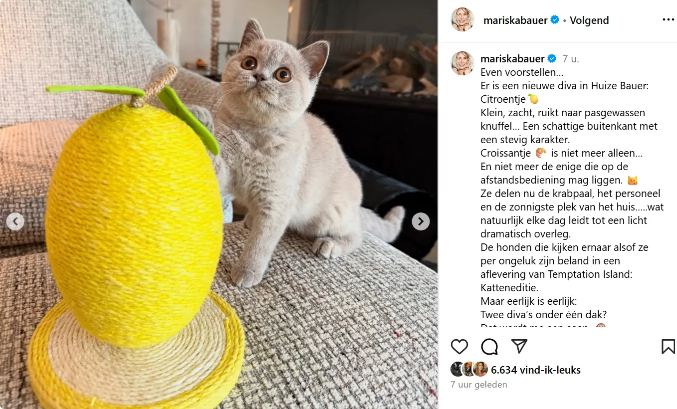 Op Instagram stelt Mariska het pluizige diertje voor. Citroentje heet het poesje en volgens Mariska is het een echte diva, wat er waarschijnlijk dus op wijst dat het een vrouwtje is. ''Klein, zacht, ruikt naar pasgewassen knuffel… Een schattige buitenkant met een stevig karakter. Croissantje is niet meer alleen…''