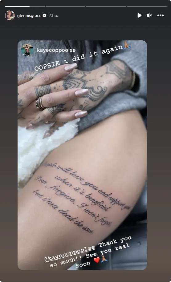 "People will love you and support you when it's beneficial. I'ma forgive, I won't forget, but I'ma dead the issue", luidt de tattoo. 'Mensen zullen van je houden en je ondersteunen wanneer het ze iets oplevert. Ik zal vergeven, niet vergeten, maar ik zal het een uitgemaakte zaak laten zijn", is een vrije vertaling hiervan.