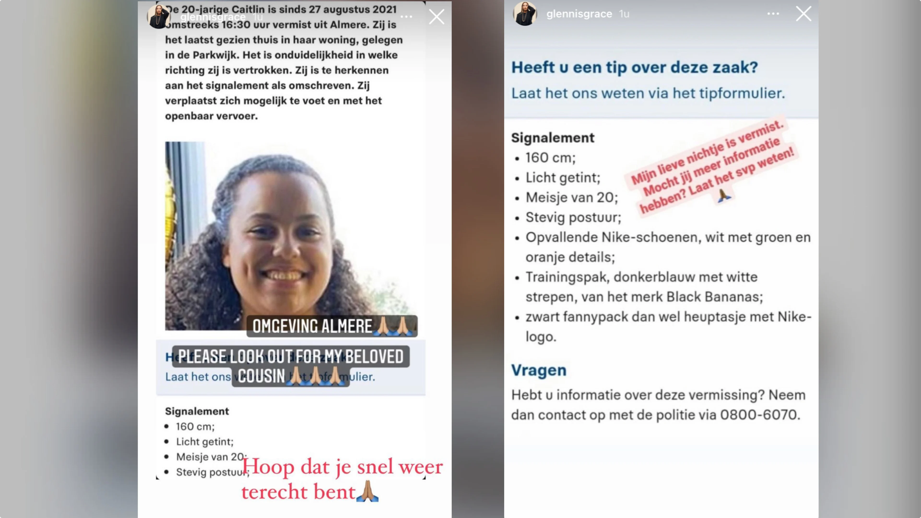 In Stories op Instagram deelt Glennis het bericht over de vermissing van haar 20-jarige nichtje. "Hoop dat je snel weer terecht bent", schrijft ze erbij. "Mocht jij meer informatie hebben? Laat het s.v.p. weten!"