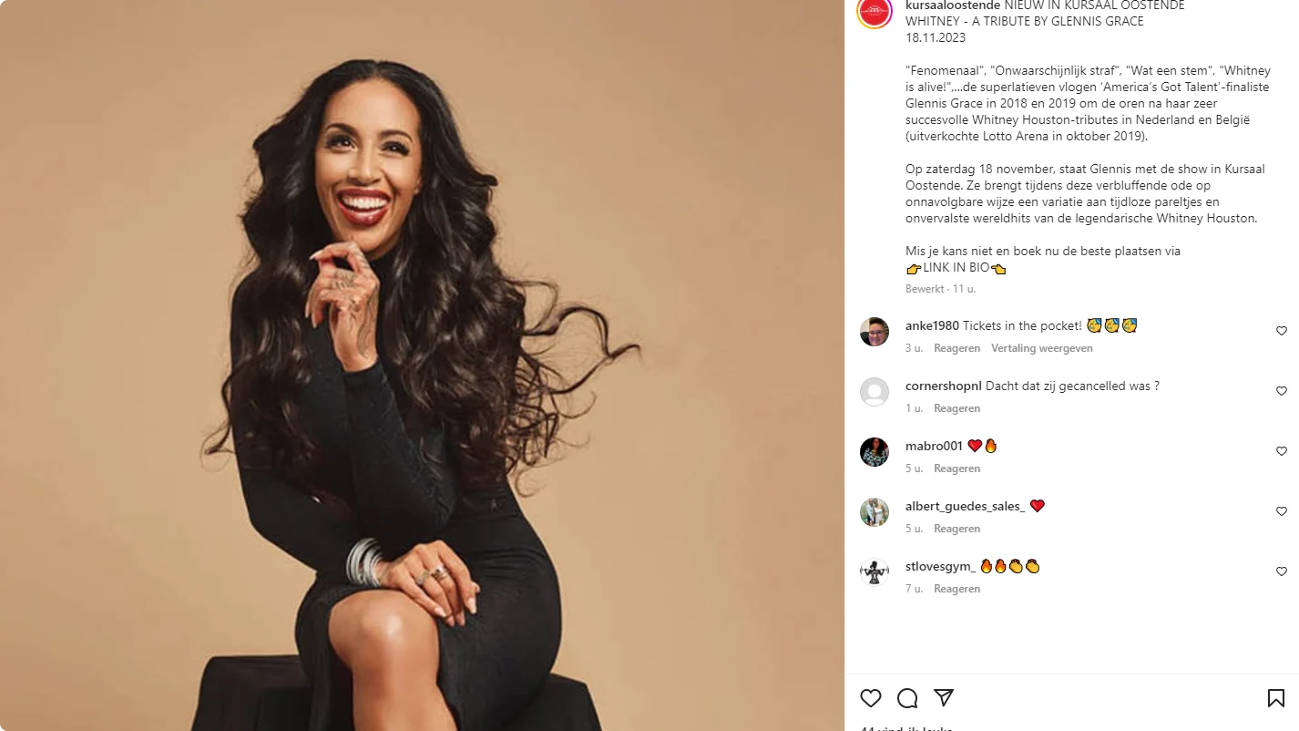 Goed nieuws voor Glennis Grace en haar fans. De zangeres is dit najaar geboekt voor een optreden in het Belgische Oostende. Ze zal daar de bekende klassiekers van Whitney Houston gaan zingen, maakt de theaterzaal bekend op Instagram.