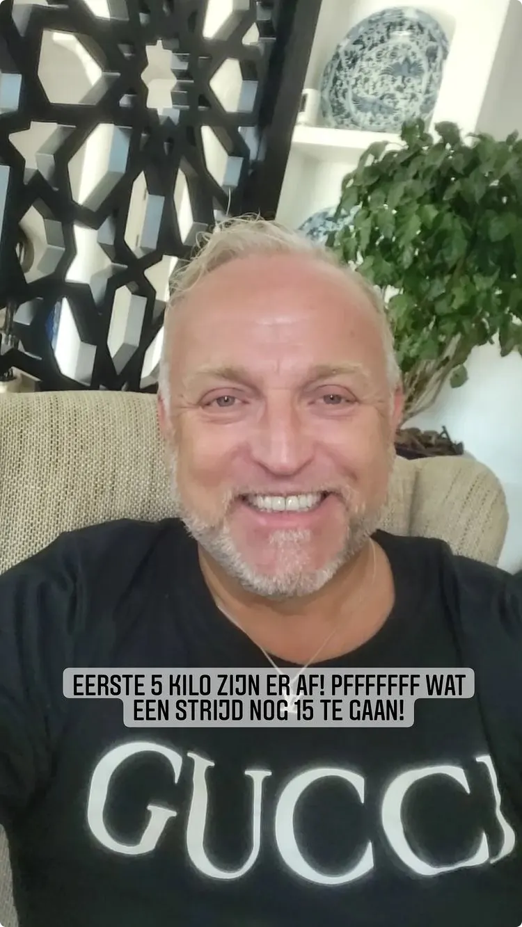 Zo plaatst hij op zijn Instagram Stories een update. Zo plaatst hij onderstaande foto, hij schrijft daarbij: "Eerste 5 kilo zijn er af! Pfffff, wat een strijd, nog 15 te gaan!"