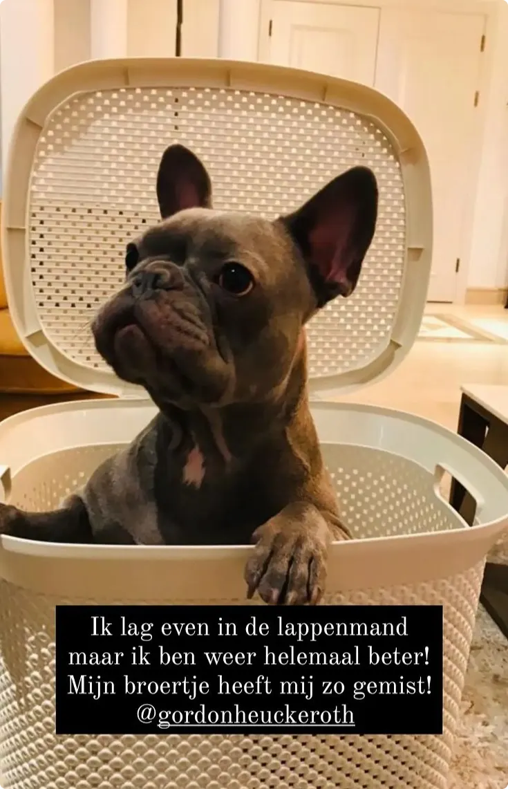 "Ik lag even in de lappenmand maar ik ben weer helemaal beter!", zo staat in een berichtje op het Instagram-kanaal van Gordons hondjes Toto en Rocco bij een foto waarop Toto in een mand zit. "Mijn broertje heeft mij zo gemist!"