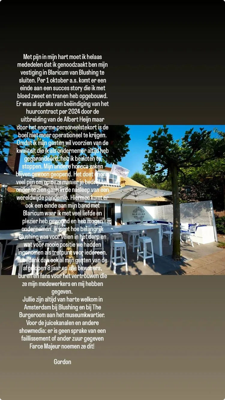 Gordon (54) heeft vervelend nieuws. Zijn horecazaak wordt gesloten. "Met pijn in mijn hart moet ik helaas mededelen dat ik genoodzaakt ben mijn vestiging in Blaricum van Blushing te sluiten. Per 1 oktober aanstaande komt er een einde aan een succes story..."