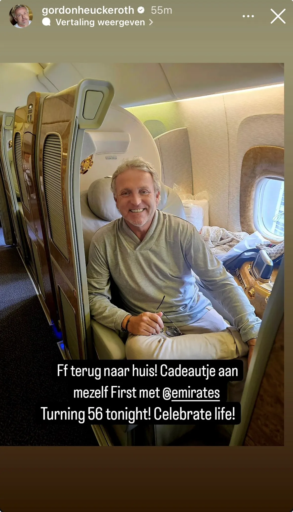 "Even terug naar huis! Cadeautje aan mezelf", aldus Goor vanuit een luxe vliegtuigstoel in zijn Instagram Stories. "Ik word vanavond 56! Vier het leven!" Hij ziet er op de foto stralend uit en lijkt helemaal klaar voor zijn volgende levensjaar.