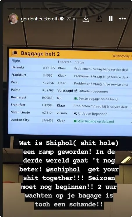 Gordon uit zijn frustratie op Instagram en schrijft in zijn Instagram Stories over het debacle: "Wat is Shiphol (shit hole) een ramp geworden! In de derde wereld gaat het nog beter! Get your shit together." Gordon briest dat hij twee uur moet wachten op zijn bagage.