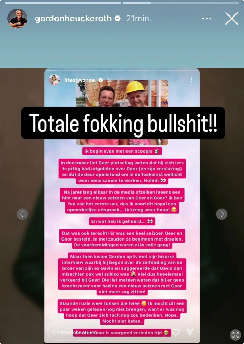 Gordon, die gisteren nog zijn terugkeer maakte op sociale media, reageert woest op het bericht van Yvonne en ontkent het hele verhaal. Zo schrijft hij in zijn Instagram Stories: "Totale foking bullshit!" Op de achtergrond is het bericht van Yvonne van eerder die dag te zien.