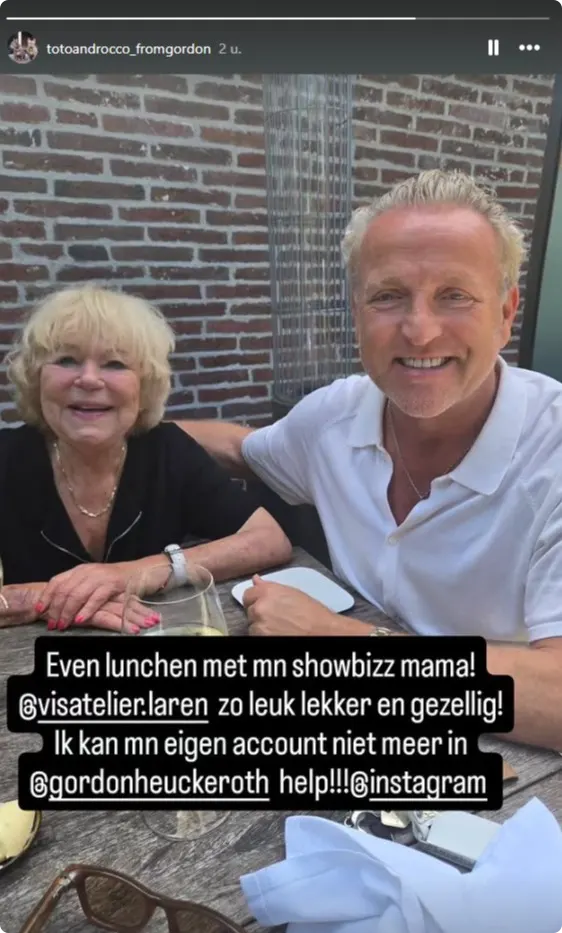 Gordon heeft donderdag een bezoekje gebracht aan zijn goede vriendin Tineke de Nooij. De twee hebben een hechte vriendschap. Bij een foto van dat bezoek schrijft hij ook dat hij dus zijn account niet meer in kan en vraagt Instagram om hulp: "Help!", schrijft hij erbij.