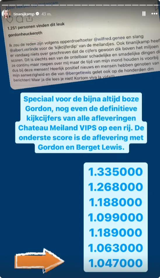 Kijkcijferexpert Tina Nijkamp heeft op het bericht van "de bijna altijd boze Gordon" gereageerd door de definitieve kijkcijfers van alle afleveringen van dit seizoen van Chateau Meiland VIPS op een rijtje te zetten. Het betreft zeven afleveringen, waarvan die met Gordon en Berget Lewis onderaan staat. De best bekeken aflevering trok gemiddeld 1.335.000 kijkers en de op één na slechts bekeken aflevering 1.063.000.