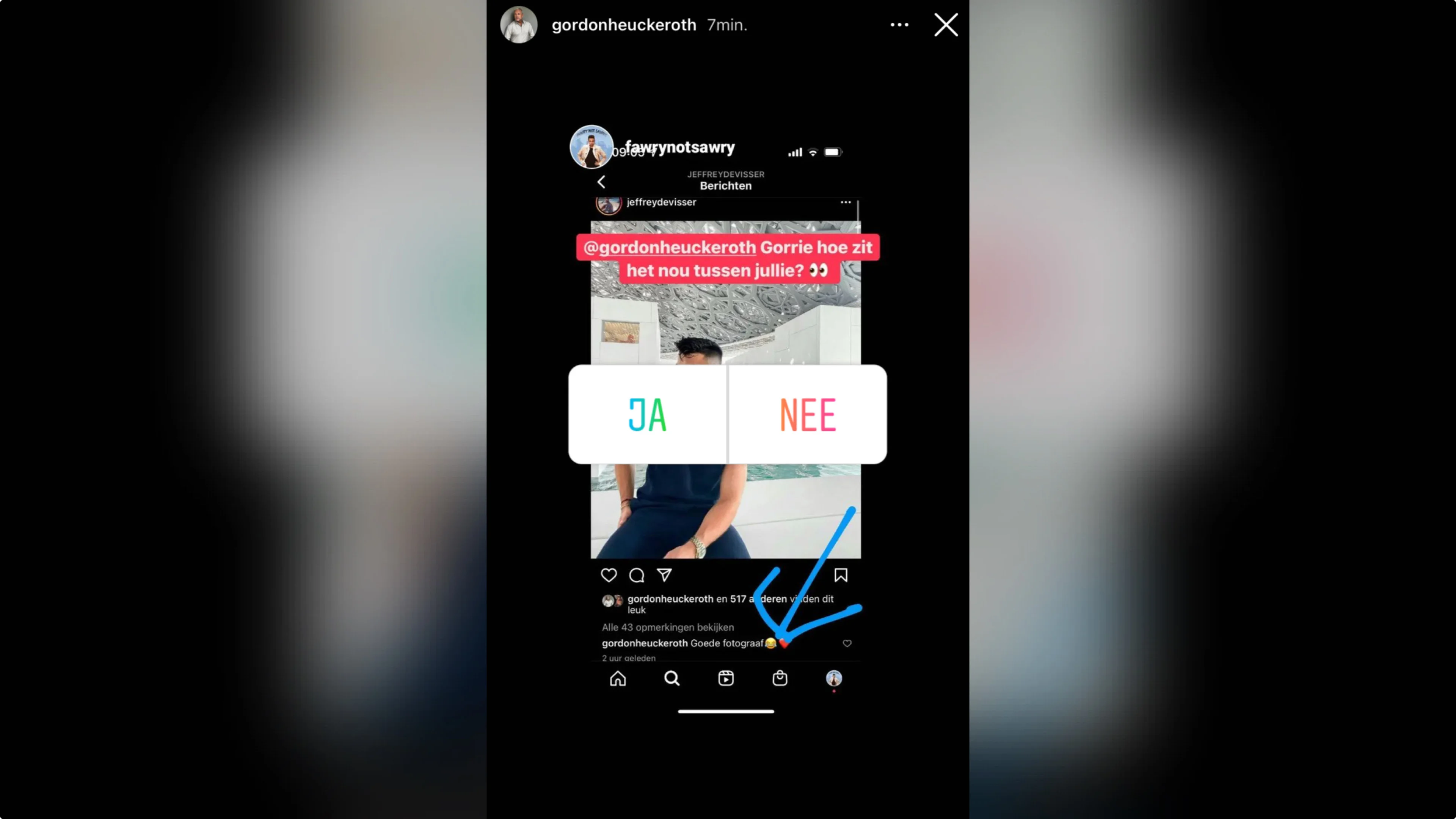 Toch lijken de twee nu in iets meer harmonie met elkaar om te gaan. Onder de foto die Jeffrey donderdag op Instagram plaatst, reageert 'Goor' met "goede fotograaf", inclusief een smiley én hartje. De reactie valt Fawry Not Sawry op en daarom vraagt hij in zijn Stories: "Gorrie, hoe zit het nou tussen jullie?"