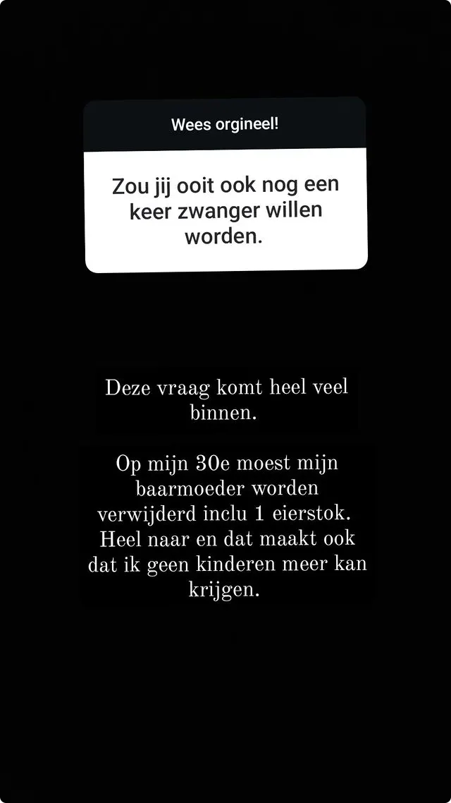 Na de aankondiging van een Q&A stromen de vragen binnen bij Greetje. In de Instagram-Story hieronder is te zien hoe de Urkse realityster antwoord geeft op de veelgestelde vraag of ze nog een keer zwanger zou willen worden. Daarop antwoordt ze: "Op mijn 30e moest mijn baarmoeder worden verwijderd inclusief een eierstok. Heel naar en dat maakt ook dat ik geen kinderen meer kan krijgen."