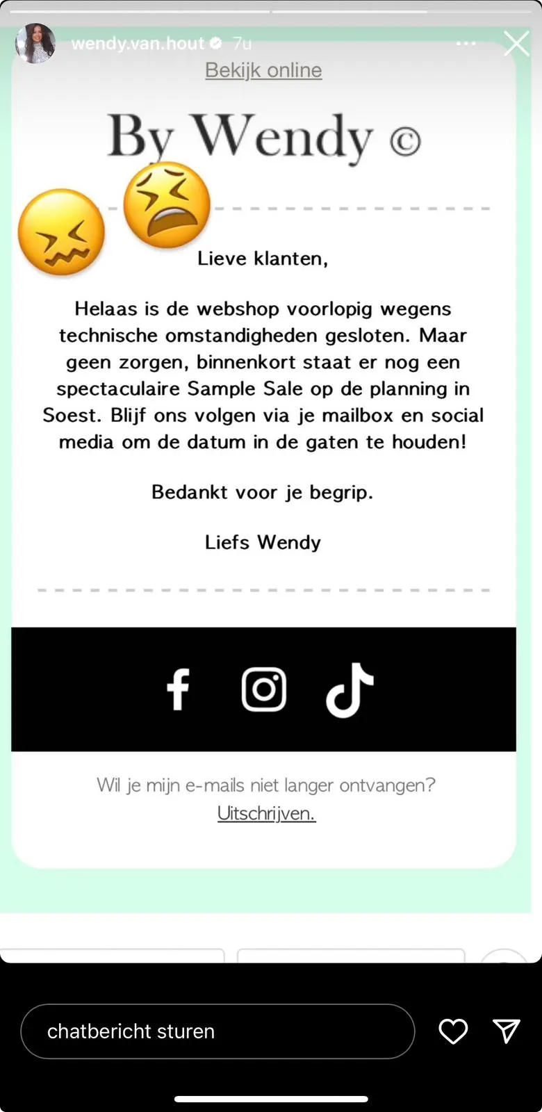 "Lieve klanten, helaas is de webshop voorlopig wegens technische omstandigheden gesloten", zo valt er te lezen in Wendy haar Instagram Stories. Inmiddels is het probleem alweer verholpen en kunnen gebruikers weer op haar website.