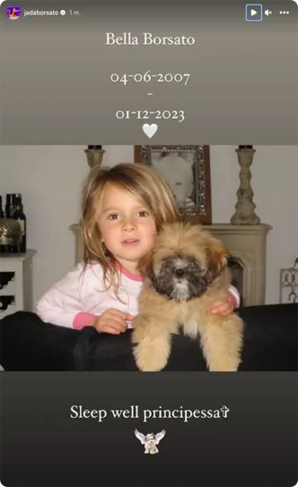 "Bella Borsato, 04-06-2007 - 01-12-2023", schrijft Jada bij een oude foto van haar en de trouwe viervoeter. Ze sluit haar bericht af met: "Sleep well principessa"