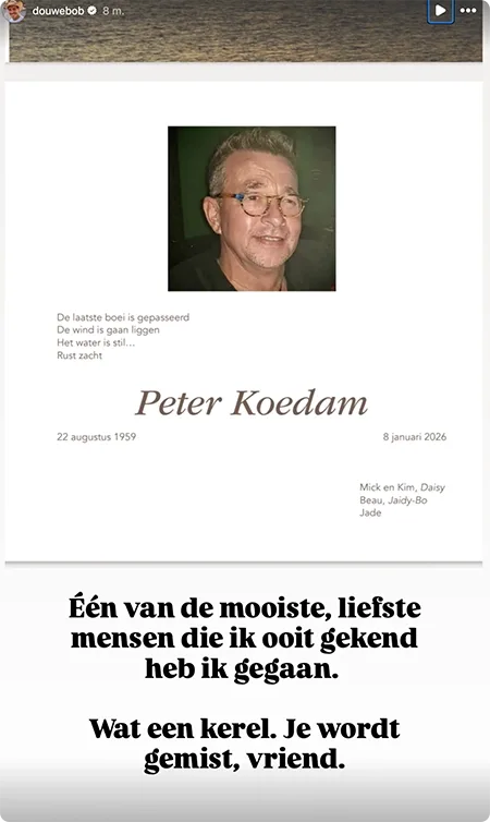 De zanger deelt op Instagram een rouwkaart van een goede vriend, Peter Koedam. "Een van de mooiste, liefste mensen die ik gekend heb, is gegaan. Wat een kerel. Je wordt gemist, vriend", schrijft Douwe bij de foto.