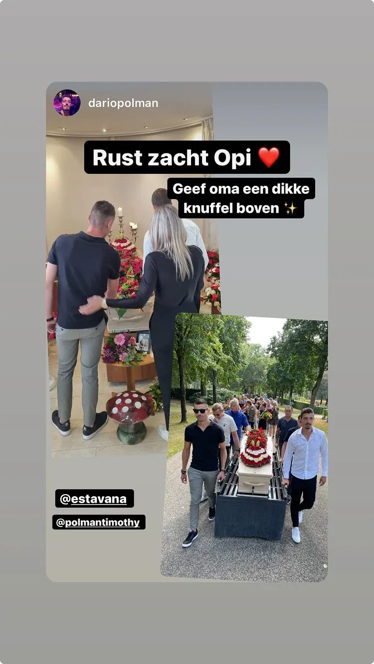 De tweelingbroer van Estavana, Dario Polman (30), deelt op zijn Instagram het volgende. "Rust zacht lieve opi. Geef oma een dikke knuffel boven."
