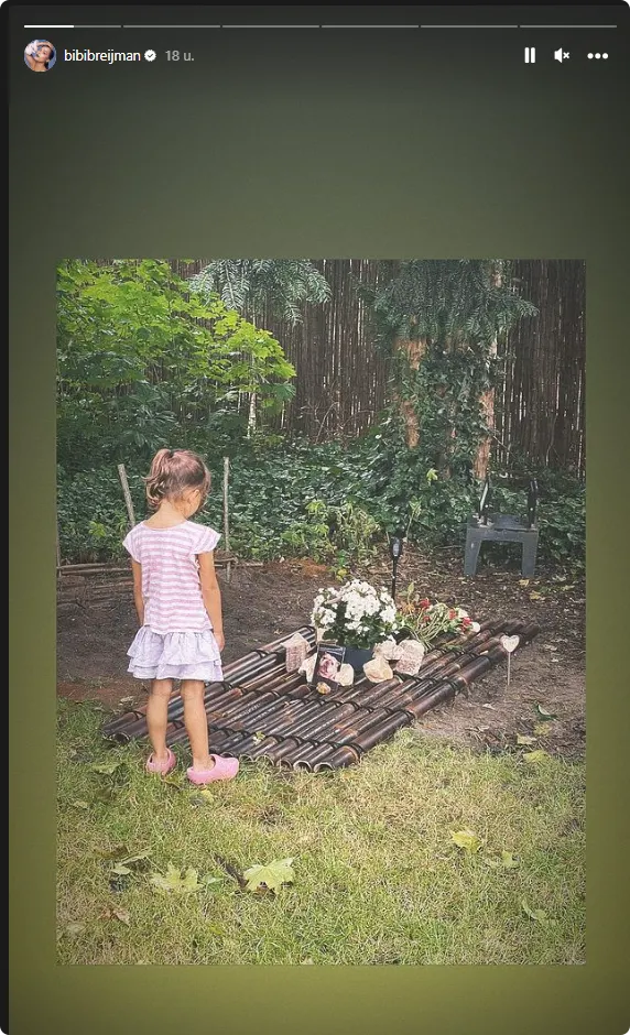 Bibi deelt in haar Instagram Stories een foto waarop te zien is dat haar dochter Teddy de Franse bulldog herdenkt.