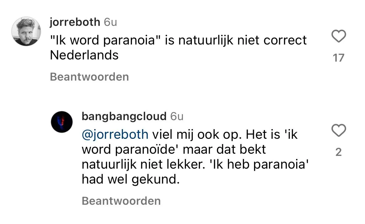 Luisteraar Tim schrijft het volgende: "Je wordt niet 'paranoia' maar paranoïde. Je lijdt aan paranoia". Een andere luisteraar raakt ook maar in de war van de woordkeuze van Maan, en besluit ChatGPT te raadplegen. Die vertelt hem het volgende: "ChatGPT: Het is niet correct om te zeggen: "ik word paranoia". Het juiste gebruik in het Nederlands zou zijn: "Ik word paranoïde". Onderstaand een greep uit de verbaasde reacties.