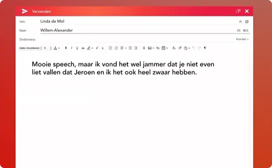 Op de Instagram-pagina van Khalid en Sophie is te zien dat zij vinden dat Linda teveel in een slachtofferrol kruipt. Ze delen een neppe e-mail van Linda de Mol aan koning Willem-Alexander, die dinsdag zijn troonrede gaf op Prinsjesdag. "Mooie speech, maar ik vond het wel jammer dat je niet even liet vallen dat Jeroen en ik het ook heel zwaar hebben."