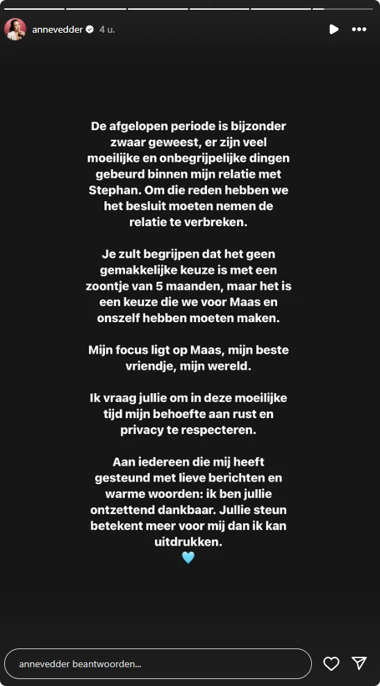 "De afgelopen periode is bijzonder zwaar geweest, er zijn veel moeilijke en onbegrijpelijke dingen gebeurd binnen mijn relatie met Stephan", begint Anne haar verhaal. "Om die reden hebben we het besluit moeten nemen de relatie te verbreken."