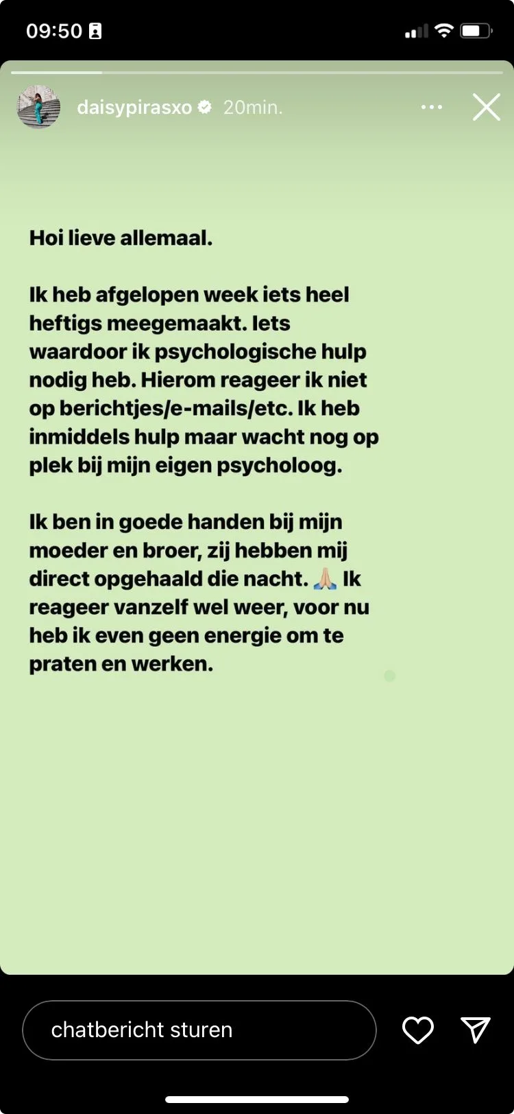 Daisy schrijft in haar Instagram Story: "Ik heb de afgelopen week iets heel heftigs meegemaakt. Iets waardoor ik psychologische hulp nodig heb. Hierom reageer ik niet op berichtjes. Ik heb inmiddels hulp maar wacht nog op plek bij mijn eigen psycholoog.