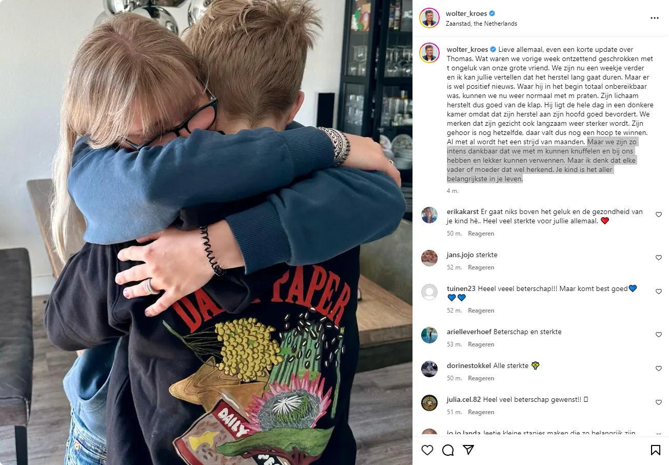 Thomas, de zoon van Wolter Kroes, heeft vorige week een ernstig fietsongeluk gehad. Hij botste met zijn elektrische fiets frontaal tegen een scooter. Hierdoor liep hij een breukje in zijn schedel op en een zware hersenschudding. De geschrokken vader laat weten dat het herstel lang gaat duren...
