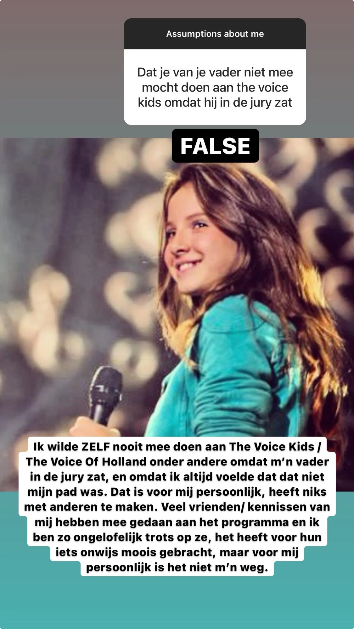 Hierop reageert de bekende dochter met: "Niet waar. Ik wilde ZELF nooit mee doen aan The Voice Kids / The Voice of Holland. Onder andere omdat m'n vader in de jury zat, en omdat ik altijd voelde dat dat niet mijn pad was."
